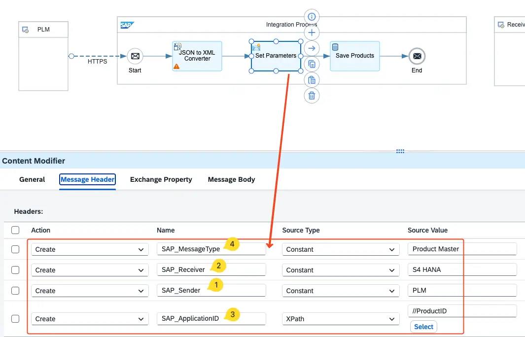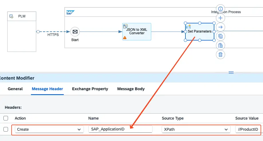 Not just SAP_ApplicationID — let’s set all the other standard parameters as well, such as SAP_Sender, SAP_Receiver and SAP_MessageType. We will set the sender system as PLM, the receiver system as S/4HANA, and the application type as “Product Master”.