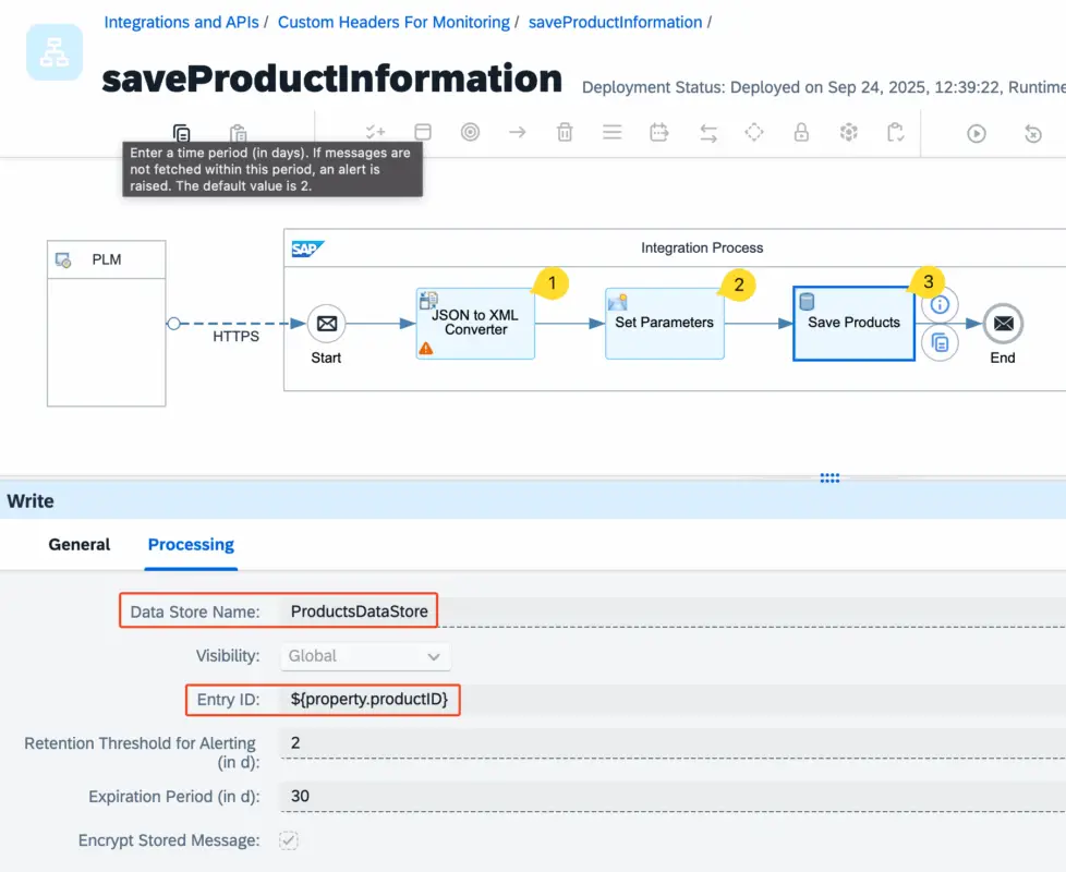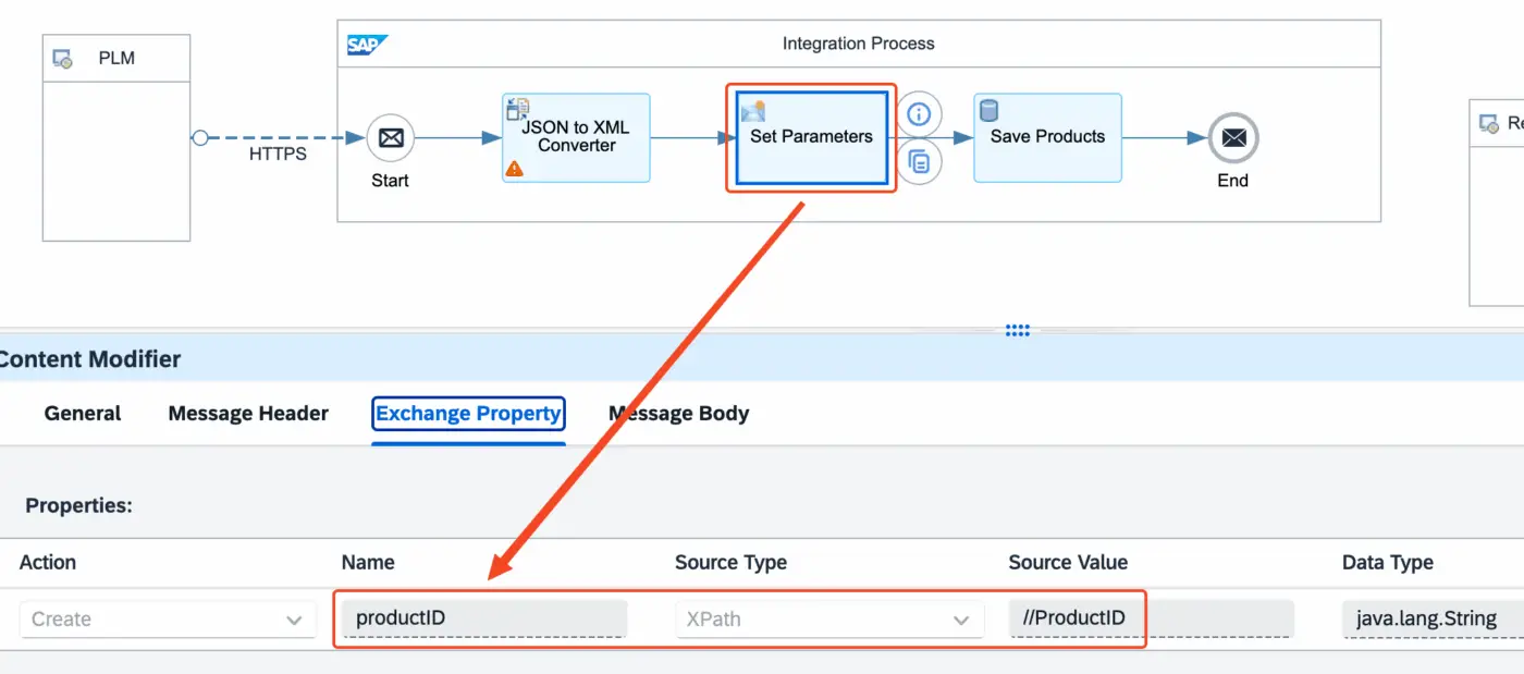 In the integration flow, we will first convert the JSON message to XML, and then extract the Product ID from the payload to use as the entry ID in the data store.