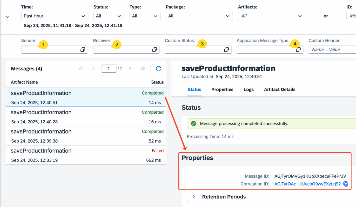 For scenarios requiring additional business-specific criteria, custom header parameters offer a great solution. By extracting values from the message payload and setting them as custom headers using Groovy scripts, you can filter messages based on business attributes, such as Order Number, Invoice Number, Article ID, etc.