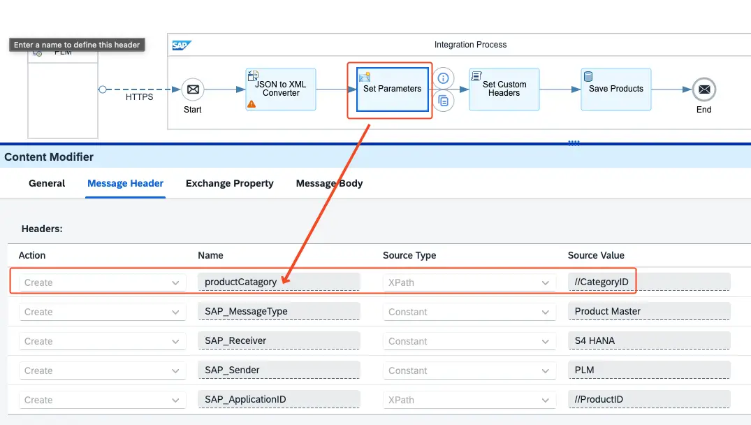 First, we will extract the required information from the payload—in this example, the CategoryID. We will use an XPath expression with a Content Modifier to achieve this.