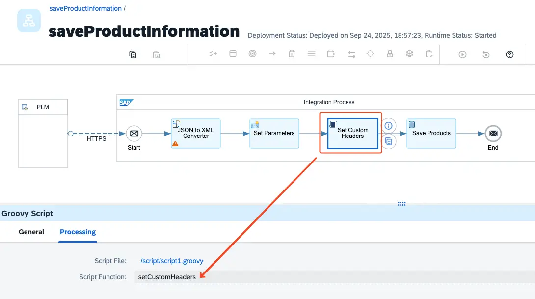 Now, from this Groovy script, we will set a custom header property named “productCategory” with the value of the exchange property “productCategory” that we set earlier using the Content Modifier.