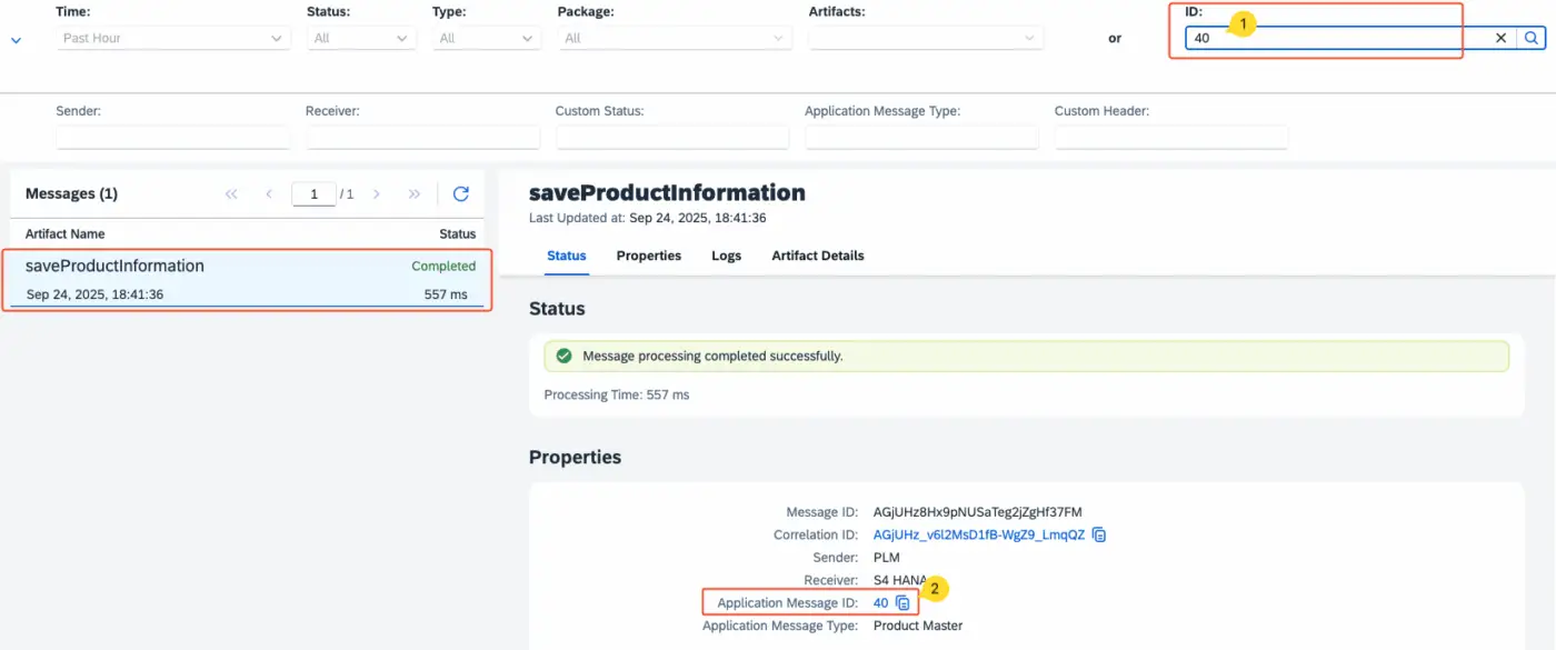For example, let’s filter the messages for Product ID 40. You can use the ID field in the Message Monitor to do this. In the same way, you can use all other standard parameters.